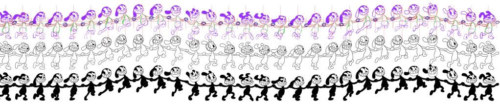I'm really happy with the fludity and movement of it though. Yep, each frame is hand drawn in photoshop, really describes why I'm so happy I've got it done! It's likely the rest won't take me as long. This one was rather complex to animate due to me wanting the character joined (that also is the reason the first figure is cut somewhat, as I'm going to join the first and last figures together) It seems to play pretty well. It was animated in flash at 14 fps, so it's really smooth. I think I'm improving artistically and technically with animation which is pleasing to see. Can't wait to see it move in real time! I think it's a pretty good homage to fleischer, sullivan and oswald the lucky rabbit!